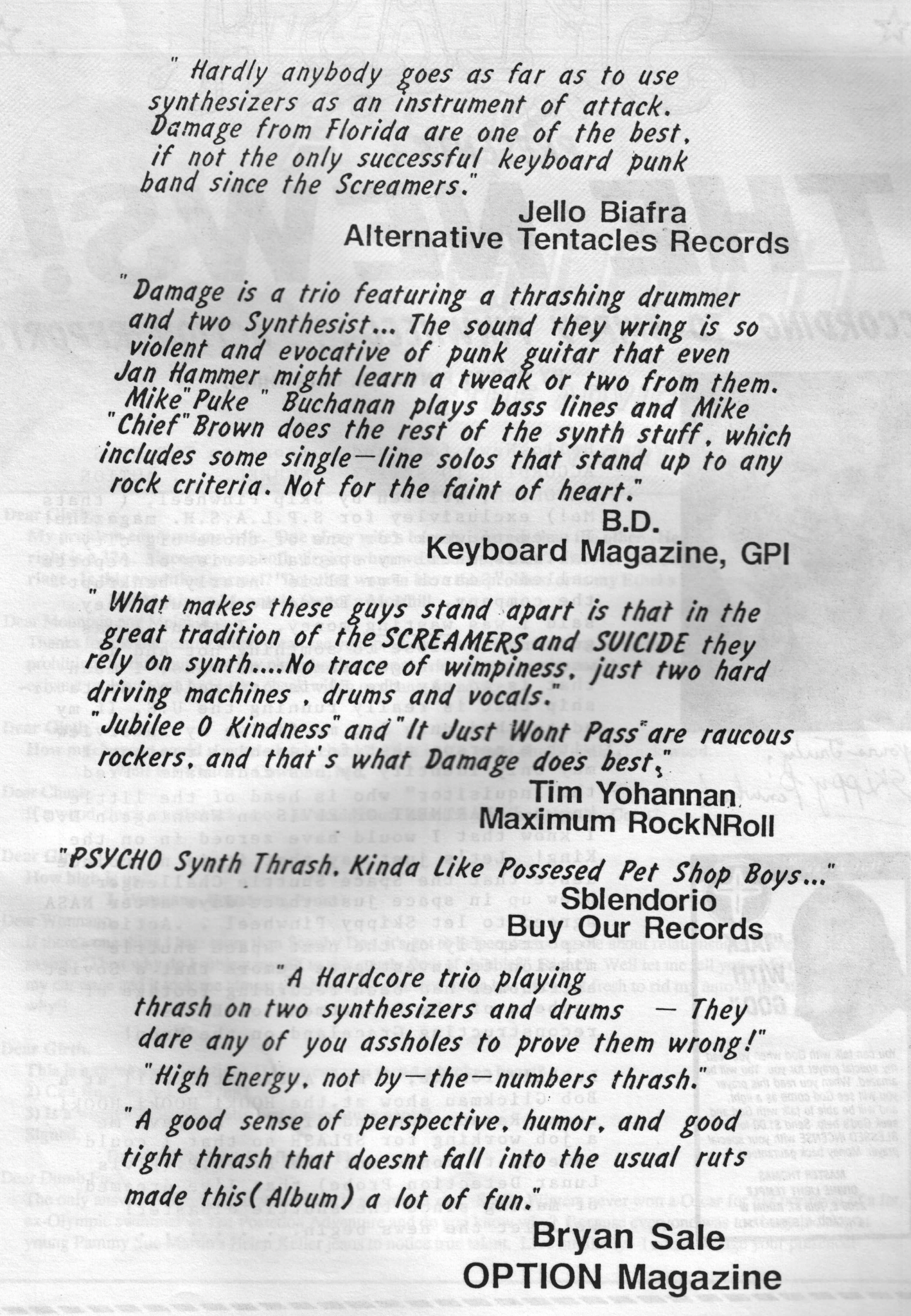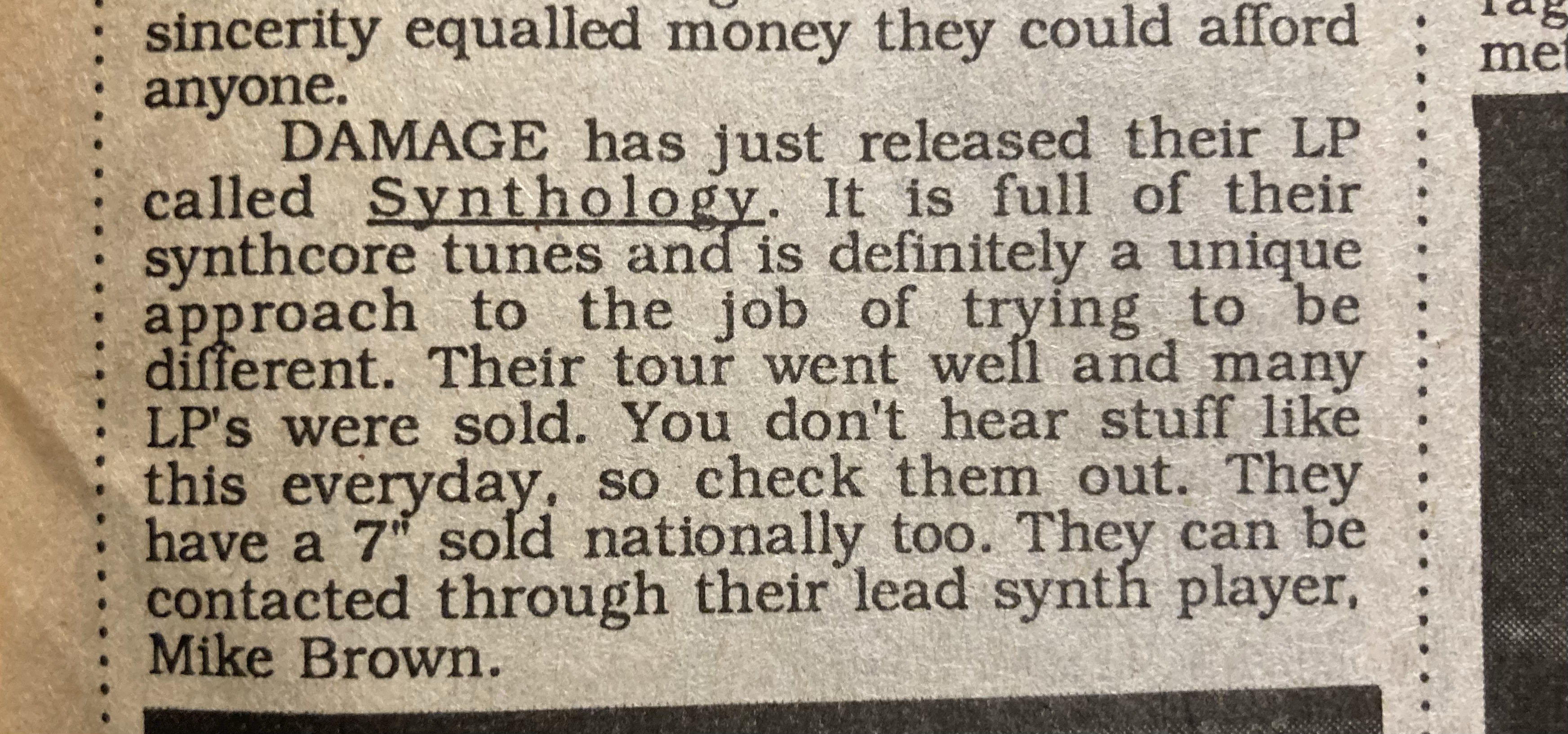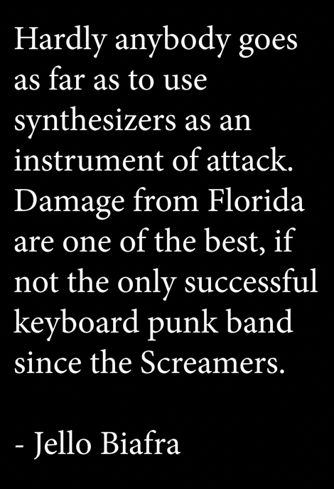 From Orlando, Florida, founded in the early 1980s. Known for delivering hardcore and punk energy through analog synthesizers and live drums — with no guitars — Damage carved out a unique space in the scene. Often compared to seminal synth-punk acts like The Screamers, Suicide, and Units, Damage pushed the speed and raw aggression of American hardcore into new, unexplored territory.